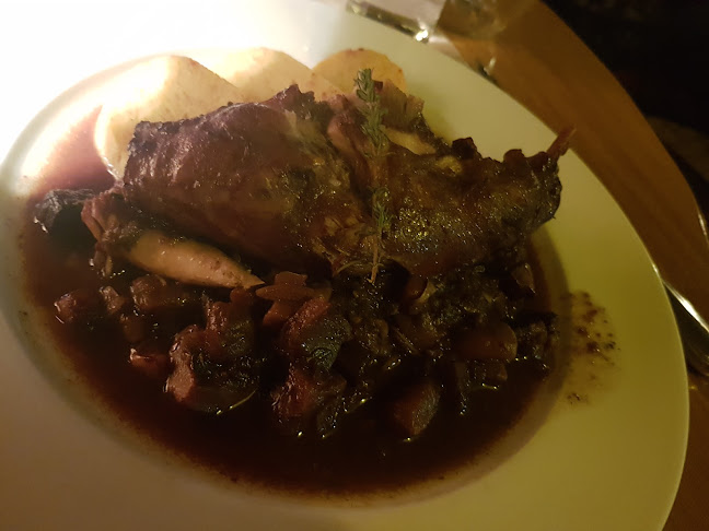 Od riadu až po interiér je cítiť, že ste vykročili do minulosti, no v dobrom slova zmysle. Objednali sme kanca s tekvicovým pyré a králičie stehno s hubami a vyskúšali sme aj nejaké miestne nápoje. Mäso bolo dobre vyrobené, ale najlepšou súčasťou jedla boli huby vo vínnej omáčke